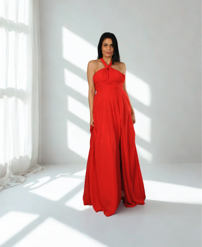 Gemaakt van mooie, hoogwaardige stof in een prachtige rode kleur. De jurk voelt luxueus en comfortabel aan, valt elegant en beweegt mooi mee. De split zorgt voor bewegingsvrijheid en een verleidelijke touch. Ideaal voor lange avonden vol glamour.