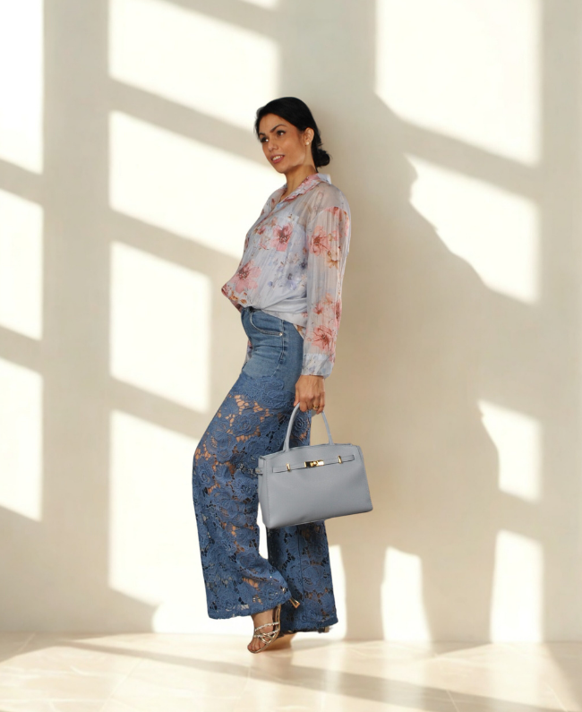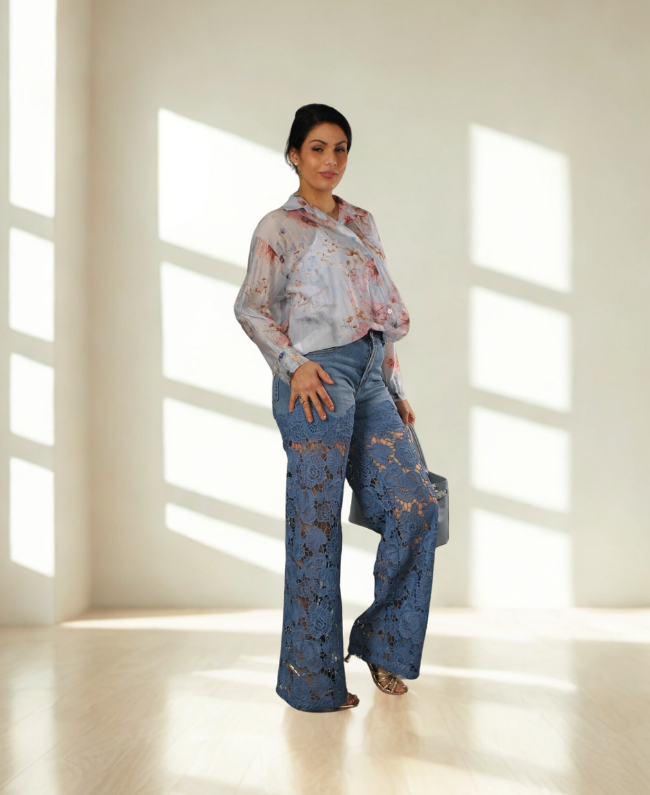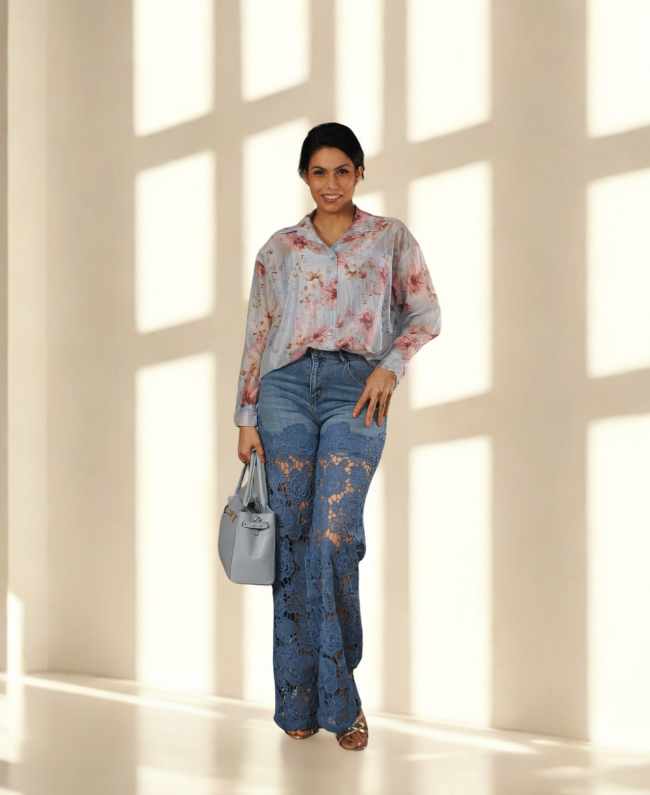 Ontdek de Blouse Fiori: een romantische licht transparante blouse met prachtige bloemenprint. Deze Italiaanse blouse combineert subtiele transparantie met bloemen en is perfect voor een romantische, vrouwelijke look.