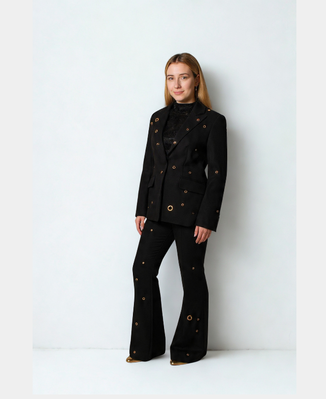 Ontdek de Suit Anelli: een stijlvol pak bestaande uit een elegante blazer en bijpassende pantalon, beide afgewerkt met open ringen als detail. Deze luxe outfit straalt Italiaanse verfijning uit en is perfect voor feestelijke gelegenheden.