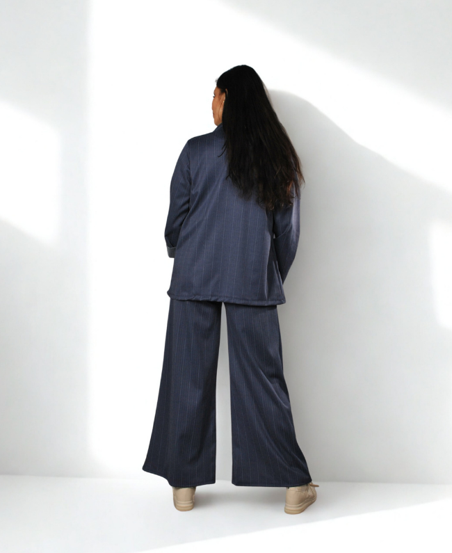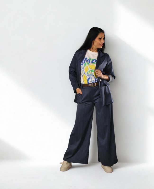 Ontdek de Suit Luna: een stijlvolle set met blazer en rechte broek in een trendy kruitstreep jeans look. Deze soepelvallende set combineert casual met chic en is perfect voor een moderne, krachtige uitstraling.