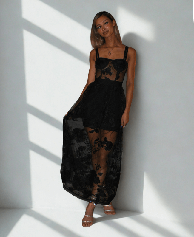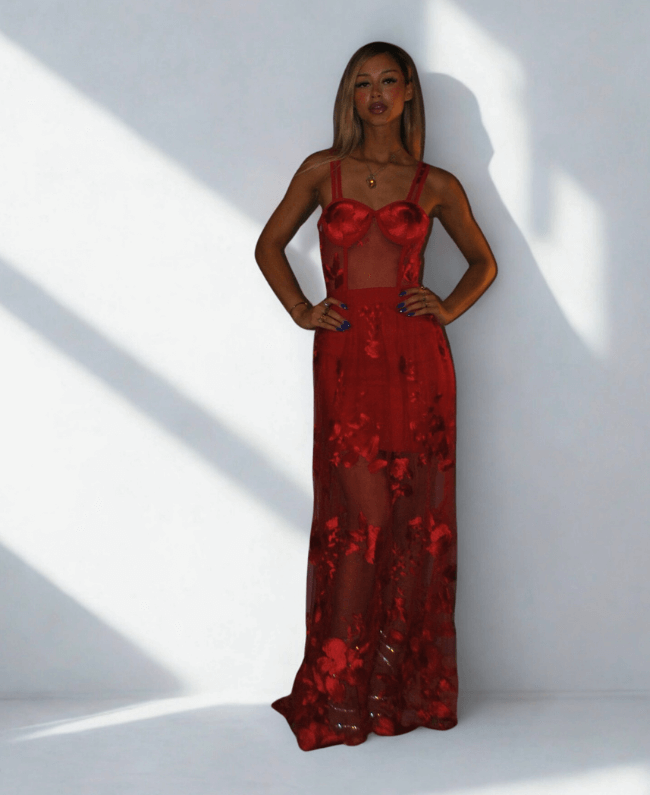 Jurk Roos met transparante onderkant en bloemenprint – verkrijgbaar in rood en zwart
