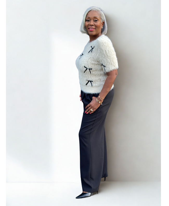 Charming short sleeve sweater , decorated with delicate bows . Perfect to add a touch of elegance to your casual wardrobe .
