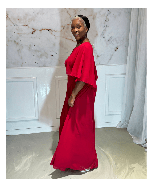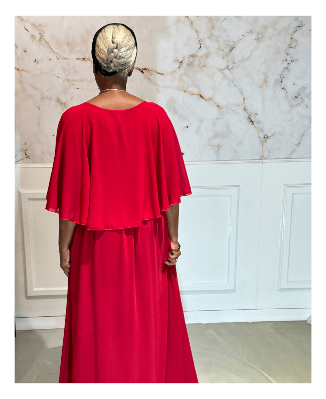 De vaste bolero geeft de jurk een elegante uitstraling en biedt extra bedekking zonder in te leveren op stijl. Perfect voor vrouwen die zich comfortabel willen voelen en er toch chic uitzien. De rode kleur zorgt voor een tijdloze, frisse look die bij iedere gelegenheid past.